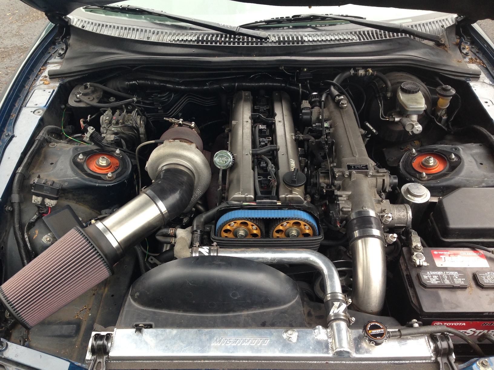 KO Racing Basid T4 Single turbo kit, 850cc/min injectors, Walbro 400 pump, Custom KO Racing IC pipes, Mishimoto Radiator, AEM Series 1 EMS tuned by Kris Osheim, KO Racing, Inc.