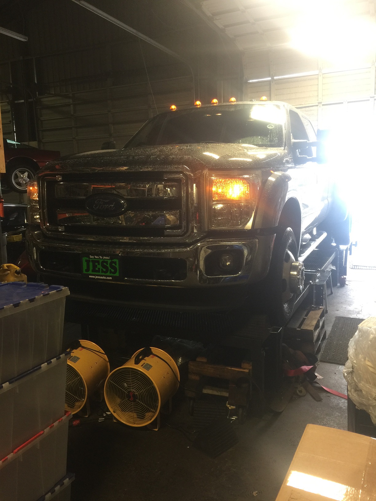 On dyno to test. 5" DPF bypass exhaust. EGR blockoff from Sinister Diesel, and H&S Mini Maxx tuner.