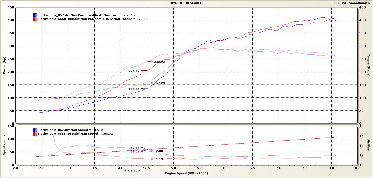 Dyno Comparison showing the spool improvement between the Precision 5558 Journal bearing and the 6262 ball bearing. Between 800 and 1000 rpm improvement in spoolup.