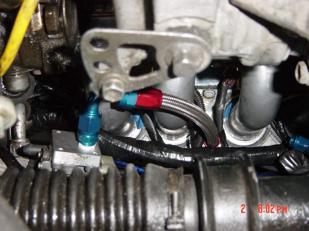 Here you can see the idle conrol motor at the end of the -8 AN line mounted to a custom mount plate designed by the owner of the car. This is looking up from under the car and the idle motor is on the firewall just above the steering rack.
