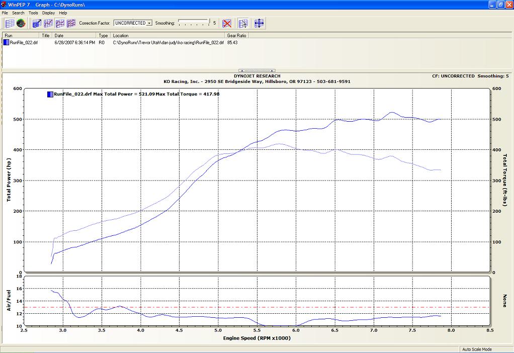 Dyno run after fixing the valve lash on the motor and lapping the head/block surfaced. 28-29psi with 114 octane leaded race gas. Nemesis tuned by KO Racing. Uncorrected correction factor on AWD Dynojet.