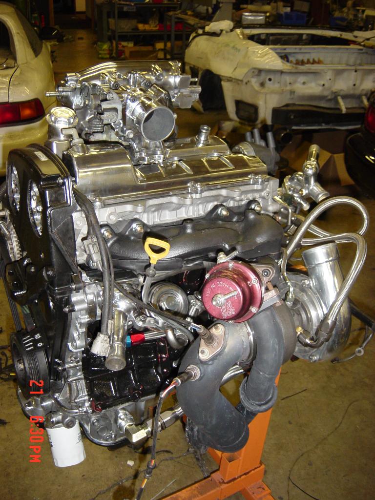Intake and turbo kit installed -- front upper timing cover opened for cam gear access.