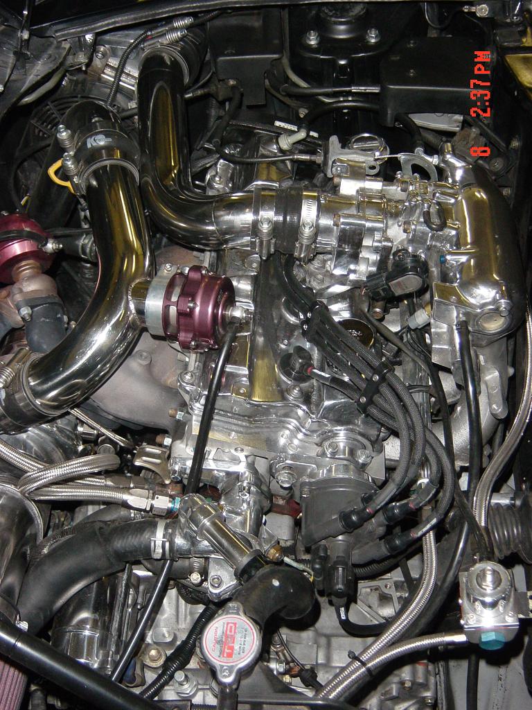 Engine bay with wires recovered in DEI wire cover, fuel pressure regulator polished, strut tower brace removed.