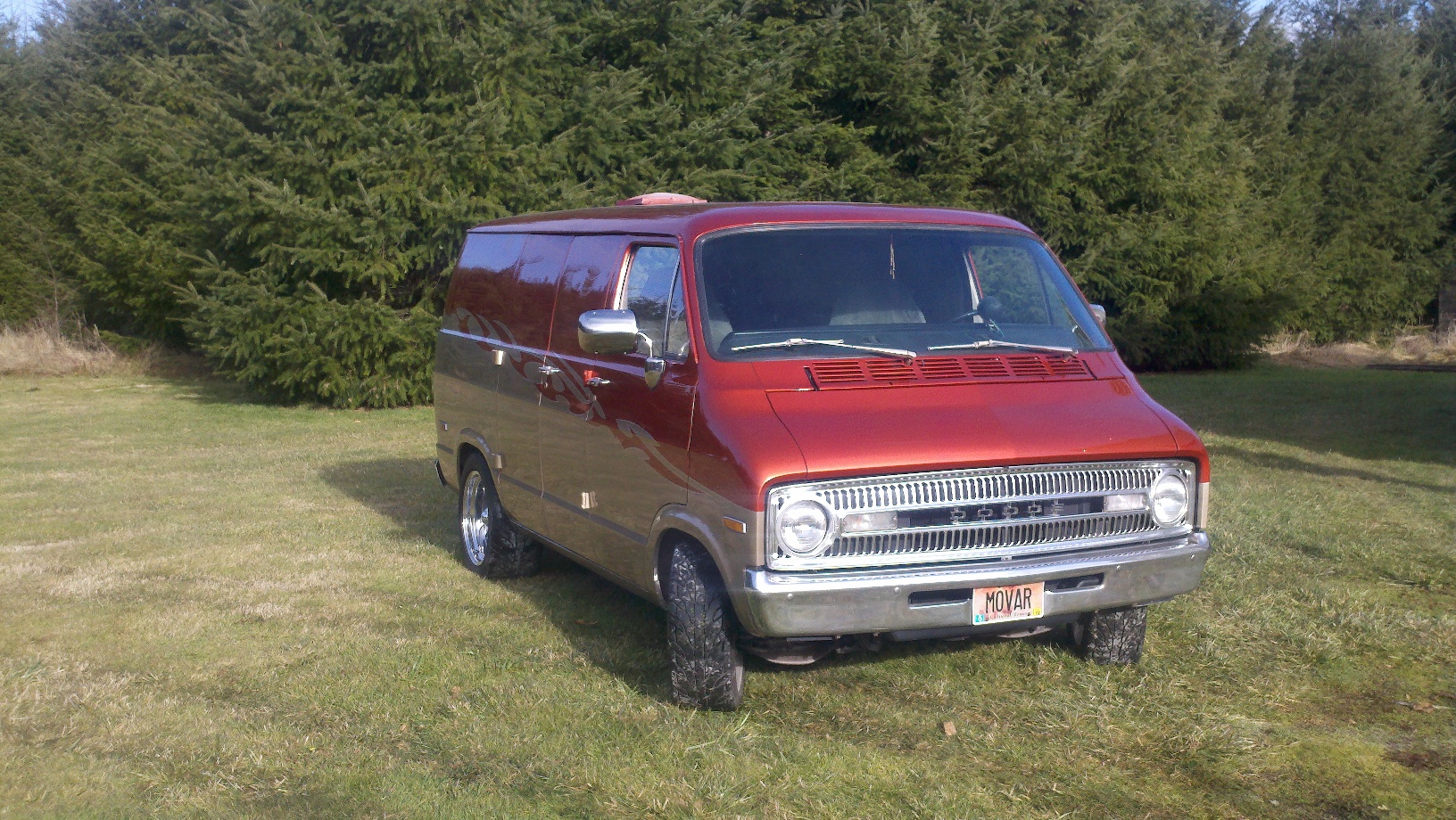 1972 Dodge Tradesman 100 Van. 360 Small Block Mopar, NOS Cheater plate system (150 shot), Dutchman Custom Ford 9" Rear with Detroit Locker and Dutchman axles, Holley 750, Crane Roller Cam, Crane Roller Rockers, Forged pistons, Cometic Head gaskets, ARP studs, Hooker Super Comp headers, Hughes 3000 stall converter, Dual 2.5" exhaust with magnaflow mufflers. 18" Billet wheels, Mickey Thompson tires.