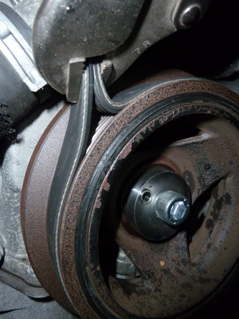 Trick for holding pulley in place while tightening bolt or loosening crank bolt. Belt is not re-usable.