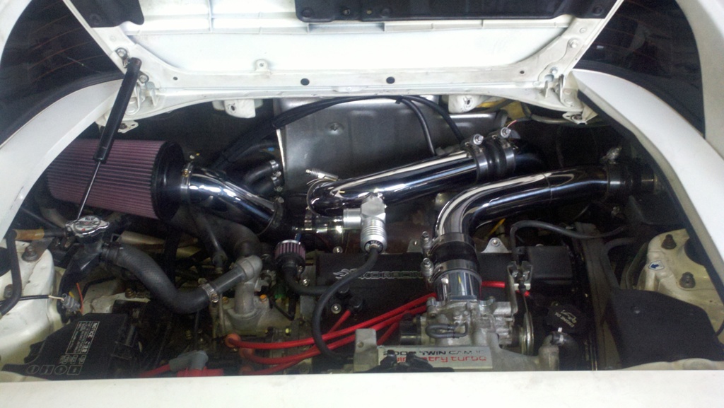 KO Racing 2.2L Blacktop Stroker engine (91mm stroke), 1mm OS Ferrea valves, custom Ross Racing .020" oversize 8.0:1 pistons, Eagle rods, ARP head studs, ARP Main studs, KO Racing modified oil pan, high volume oil pump, new OEM water pump, 1.4mm Cometic head gasket, Kelford 258 duration cams, Fidanza cam gears, ported/polished head, KO Racing 3" intake, KO Racing Street Brawler 46trim t3/t4 (.48 A/R turbine), Spearco IC with KO Racing intercooler pipes, MSD plug wires, MSD Blaster SS Coil, Precision 880cc/min injectors, Wolfkatz top feed fuel rail, Walbro 255 fuel pump