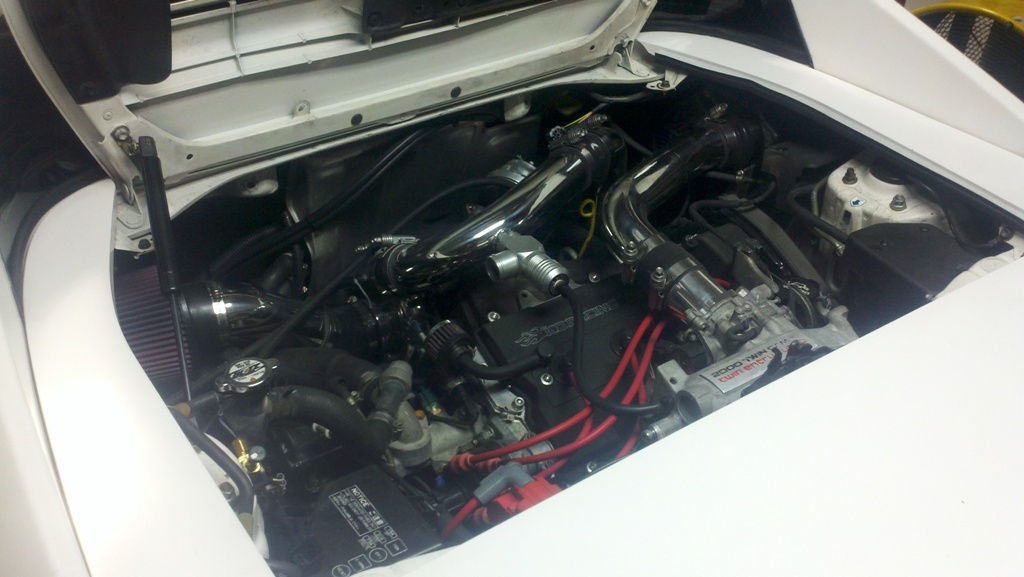 KO Racing 2.2L Blacktop Stroker engine (91mm stroke), 1mm OS Ferrea valves, custom Ross Racing .020" oversize 8.0:1 pistons, Eagle rods, ARP head studs, ARP Main studs, KO Racing modified oil pan, high volume oil pump, new OEM water pump, 1.4mm Cometic head gasket, Kelford 258 duration cams, Fidanza cam gears, ported/polished head, KO Racing 3" intake, KO Racing Street Brawler 46trim t3/t4 (.48 A/R turbine), Spearco IC with KO Racing intercooler pipes, MSD plug wires, MSD Blaster SS Coil, Precision 880cc/min injectors, Wolfkatz top feed fuel rail, Walbro 255 fuel pump