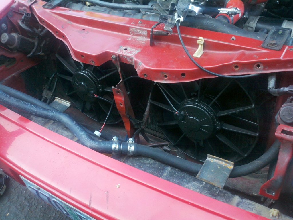 Spal 11" high performance pushers on radiator controlled by AEM EMS. In dash touch screen computer.