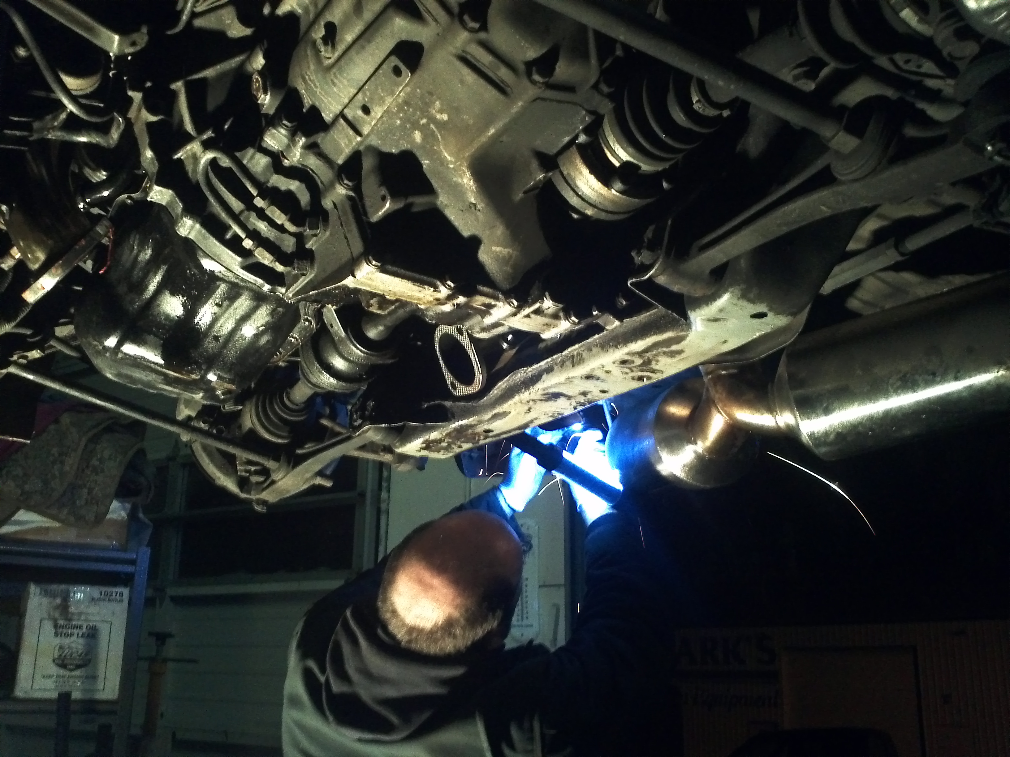 cutting the exhaust shop welded bolts to remove the exhaust system