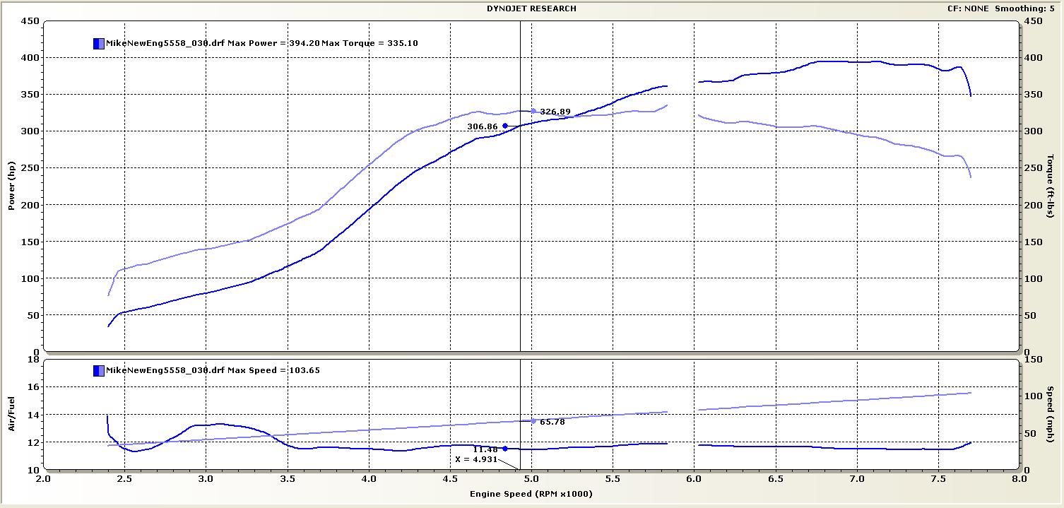 KO Racing SuperStock Motor with 1mm OS Supertech Valves, JE .020" over pistons, KO Racing Street Brawler Ramhorn Manifold, Precision 5558 turbo, Tial MVS wastegate, Engle Valve springs, Gen 3 3SGTE intake cam, Gen 2 3SGTE exhaust cam retarded 6 degrees on AEM cam gear, 850cc/min Siemens Top Feed injectors, KO Racing Phenolic TVIS eliminator (brown), KO Racing 3" SS R1 exhaust (custom driver side exit), KO Racing high performance side mount intercooler, 92 octane Chevron Supreme fuel, Hydra Nemesis 2.17 tuned by Kris Osheim, KO Racing, Inc. 3rd Gear run.