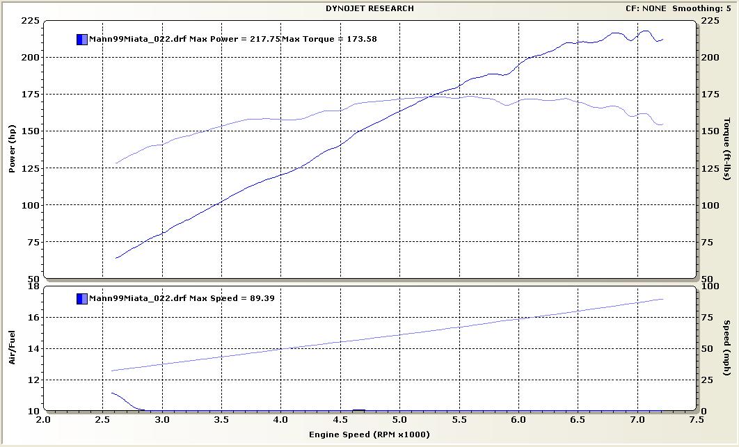 First dyno run with the Flyin Miata base map with the car running 12psi peak (using a restrictor in the 3" exhaust) -- off the chart rich and conservative timing advance makes for a very safe tune.