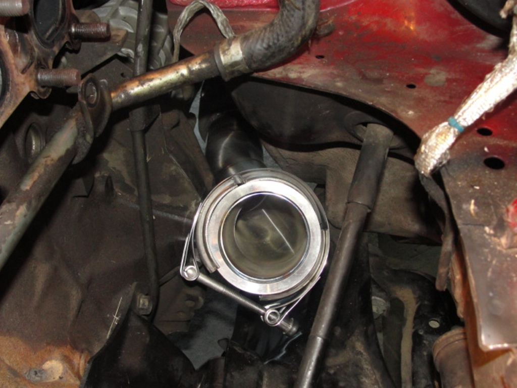This is where the mid-pipe reaches up to. Very easy install from below and the bolt on the v-band clamp is accessed through the access hole between the body and the subframe.