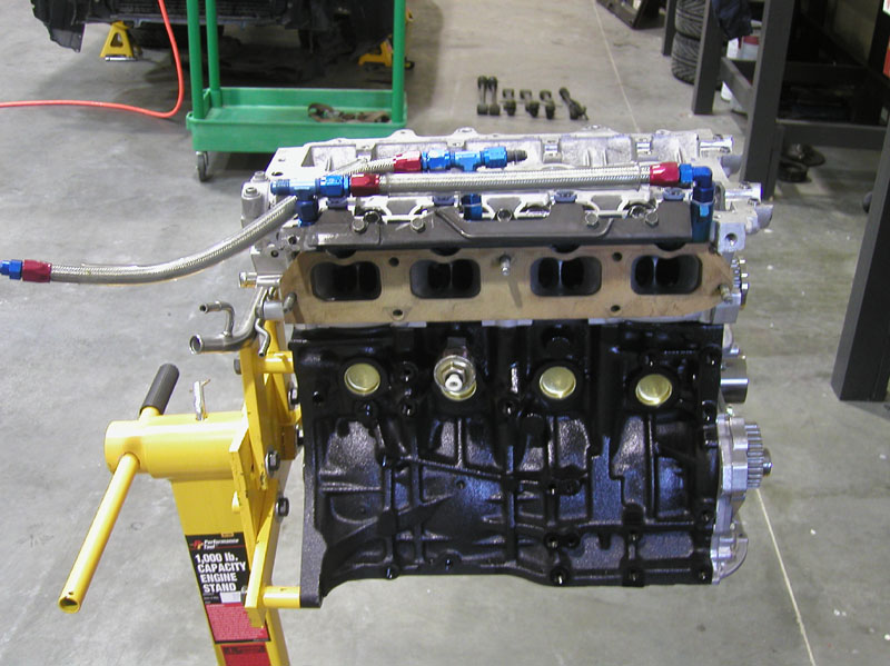 The head received a mild porting, mostly just removing casting marks and other obstructions to flow. The coolant passages around the #3 cylinder were enlarged slightly, since that cylinder tends to run a little hotter than the other 3. The TVIS (Toyota Variable Intake System) was removed, and a phenolic resin spacer was installed in it’s place. The purpose of this is twofold: the spacer will insulate the intake manifold from the head, preventing heat transfer to the manifold, and thus the intake charge, and in high horsepower applications, the TVIS can become a significant obstruction, even when open.