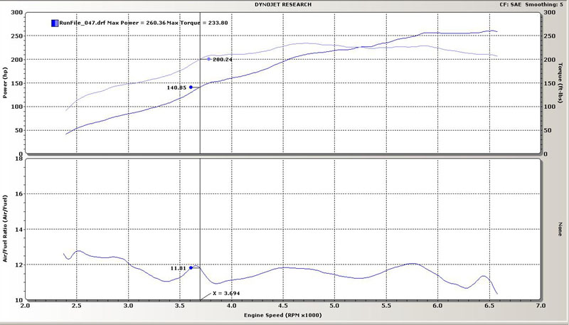 With the engine re-installed in the car, it was time to put the car on the dyno for the initial tune, which would be used to break in the engine for 1000 miles. I have the boost controller turned off, which has the car running at 10PSI (maximum), which is the spring pressure for the Tial 38mm wastegate that I am running. The engine and turbo kit are performing incredibly well at 10 PSI, putting down 260 rear wheel horsepower, and 233 foot-pounds of torque.
