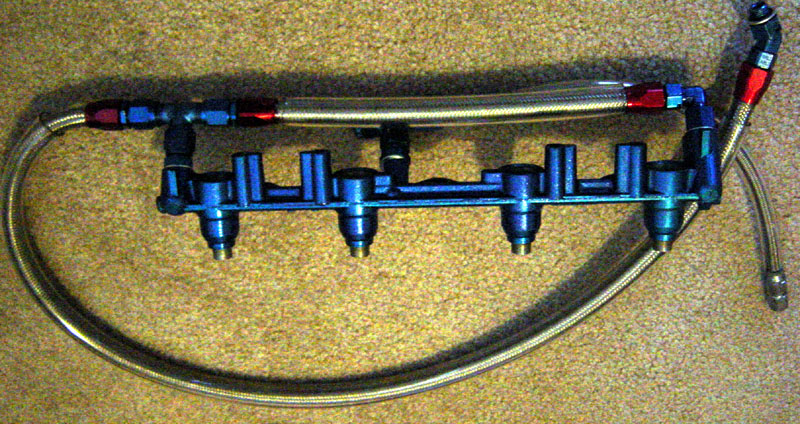 The next thing to look at is the fuel rail. The stock fuel system is a sequential side feed rail, which means that the fuel comes in at one end of the rail, and passes through each injector in sequence, until it reaches the #4 cylinder. The stock rail has a standard 1:1 rising rate fuel pressure regulator on it. This setup inevitably results in the #3 and #4 injectors being starved of fuel, compared to the #1 and #2 injectors. That resulted in a popular mod, which is known as a DFFR (Dual Feed Fuel Rail). The rail is fed from both ends, and the interior bore of the rail is increased, allowing more fuel to flow to each injector, and virtually eliminating the fuel starvation problem. An aftermarket adjustable fuel pressure regulator is typically installed at the same time as the DFFR, to allow adjustment of the base, or idle, fuel pressure.