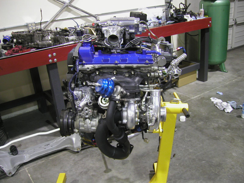 With all of the time, work, planning, and money spent getting this engine ready to make big power, it’s time to choose the turbo kit I’ll be using. One of the most important factors when choosing a turbocharger is SIZE. Proper sizing of the turbo to the engine is critical to achieve a wide power band, with a nice, fat torque curve. There is an increasing trend in the MR2 community, and the import community as a whole, to look ONLY at peak rear wheel horsepower numbers when choosing a turbo. This results in a lot of unhappy people, when they get their turbo kit after months and months of saving, and waiting, and they don’t hit full boost until past 4000RPM. Since the stock rev limiter is at 7250, this will yield a very narrow power band, especially if you are running the stock cams, which limit peak horsepower to about 6000RPM. A car like this is not very much fun to drive, except at the track or drag strip, since you are constantly shifting gears to try to keep the car in it’s power band, and spending a lot of time waiting for the turbo to spool up. The answer to this is the KO Racing Street Brawler turbo kit.
