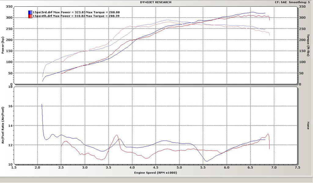 With that problem cleared up, we were able to raise boost to 15PSI, where the car is making 323 rear wheel horsepower, and 288 foot pounds of rear wheel torque. We are running out of injector at 15PSI/6500RPM, so we’ve temporarily set the Rev limit there, until product development on a KO Racing Top Feed Fuel Rail with 880cc/minute injectors can be completed. At that time, I will be upgrading the down pipe and exhaust to 3 inch diameter piping, and upgrading the EMS to the Hydra Nemesis. We will then retune the car for 20PSI, which will hopefully yield between 380 and 400 rear wheel horsepower.