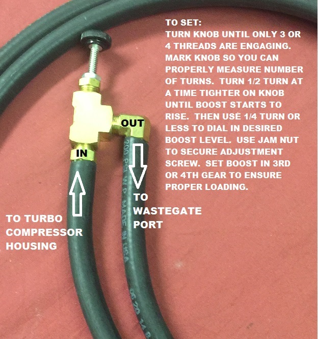 5. when the boost starts to rise above the minimum, only increase boost by turning 1/4 of a turn at a time and then finer as you approach your desired boost level. be sure to tighten the jam nut to secure the adjustment screw each time the boost is raised.