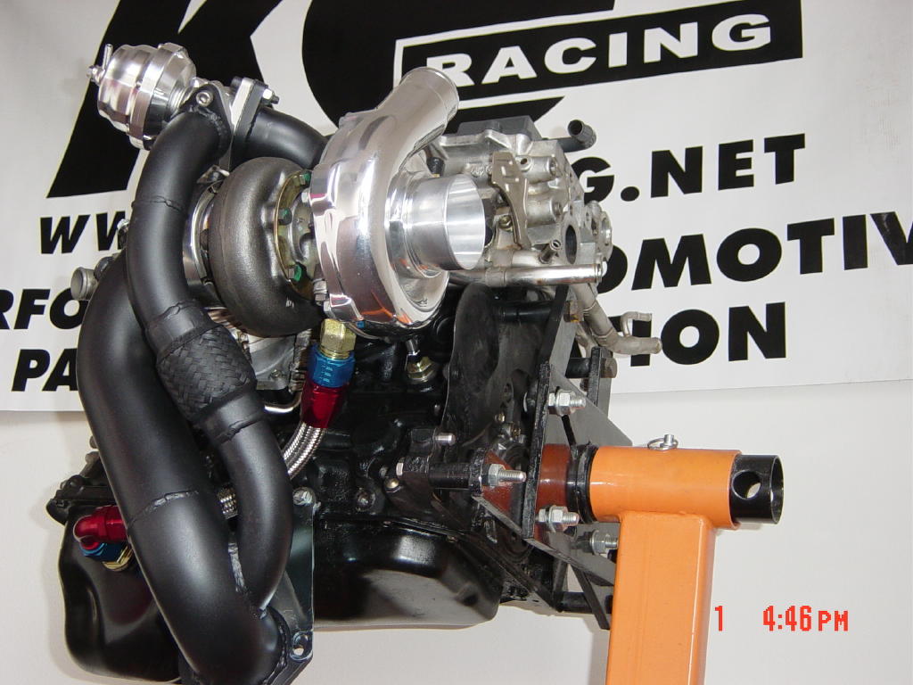 KO Racing turbo kit for the MR2 and Celica Alltrac/GTFour 3SGTE engines. The Street Brawler T3/T4 Turbo kit was developed exclusively for the Toyota 3SGTE Engine (will fit MR2 and Celica All-trac), to provide near to stock turbo spool, while allowing 300+ rear wheel horsepower to be achieved at 20PSI or less (with supporting modifications). The kit includes a manifold adapter, which is CNC machined from a solid steel billet and bolts to the stock manifold to retain OEM reliability. The other components include a full 3" mandrel bend down pipe with integrated 1.75" diameter wastegate dump tube, with it's own flex section, a Tial 38mm or Tial 44mm external wastegate, and all lines, gaskets, and mounting hardware needed to install the kit. More pictures can be seen in the photo gallery.