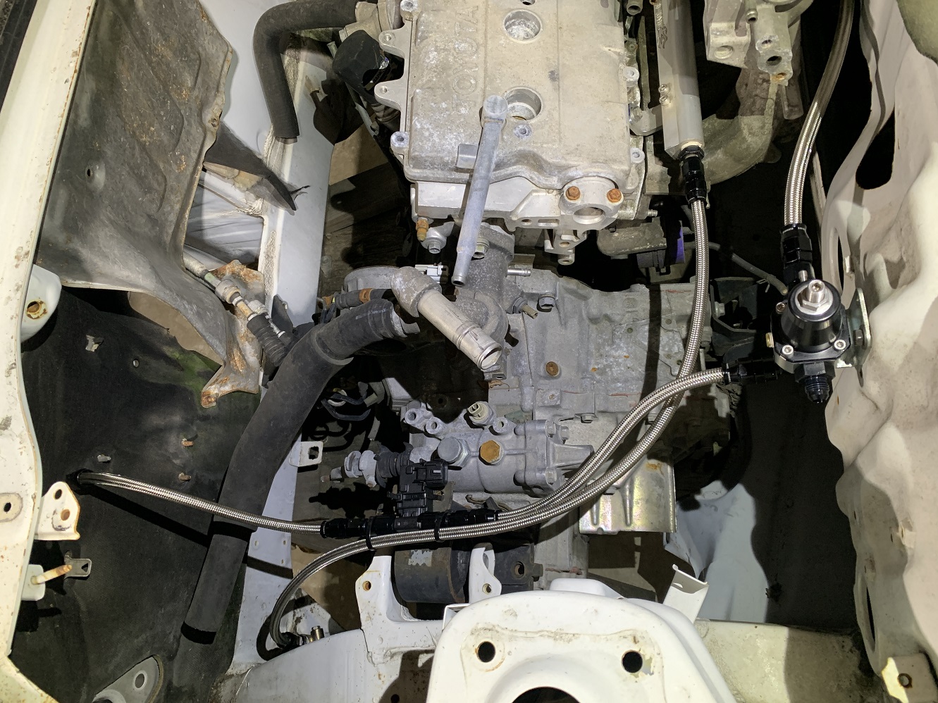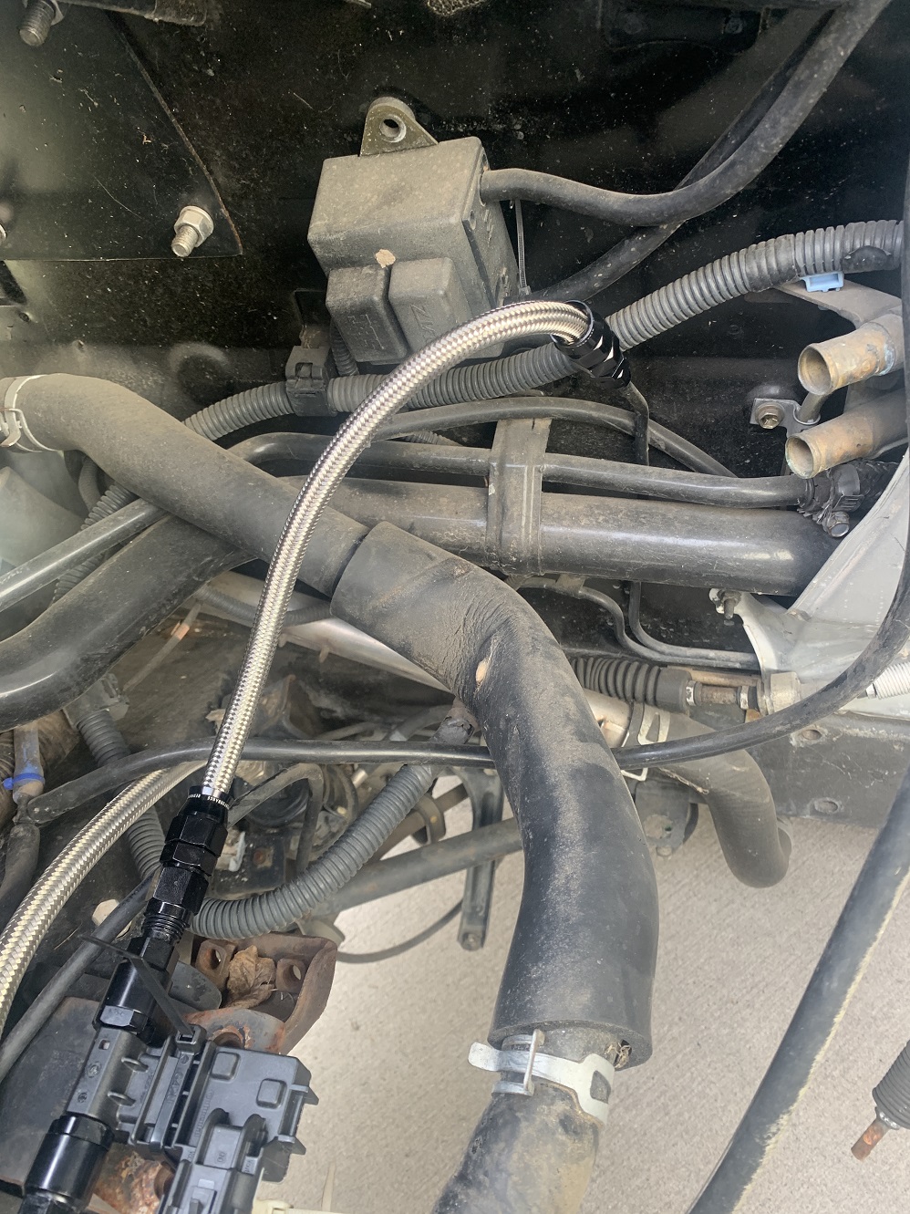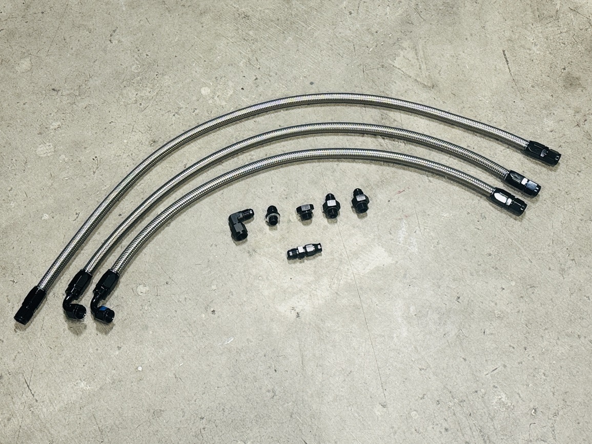 A fuel line kit for use with the factory filter, and an aftermarket adjustable fuel pressure regulator. Out kit is designed to mount the regulator near the factory engine bay fuse box: